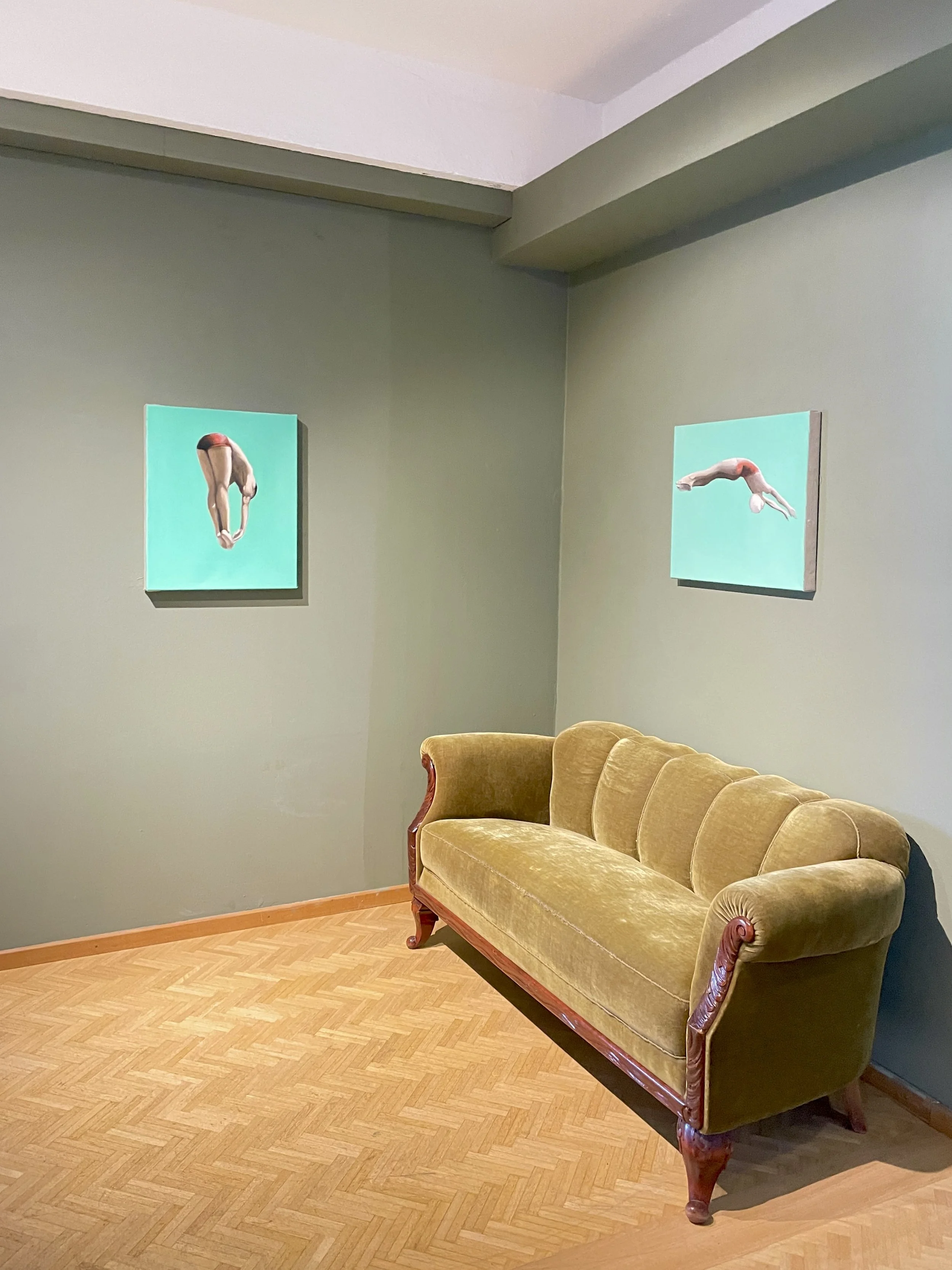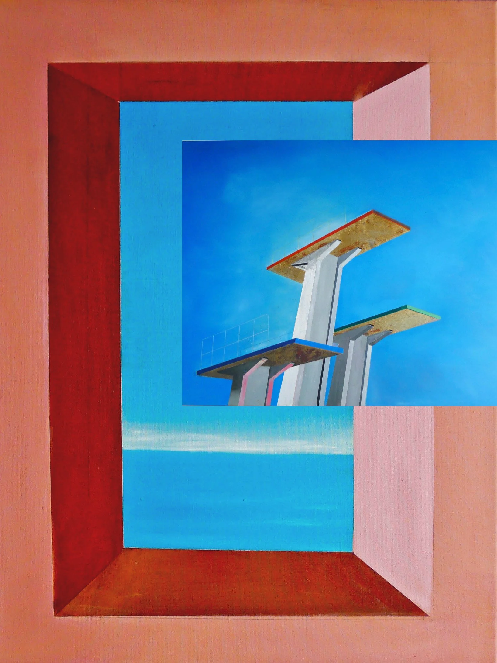 nello spazio - Christine Gallmetzer offre esperienze visive spirituali e visionarie che spesso sembrano ancorate nella quotidianità e tuttavia sono irritanti, generano perplessità e hanno qualcosa di transitorio, affascinante. La mostra molto articolata di Castelbello, intitolata „momentaneamente“,che presenta un numero limitato di dipintidi grande intensità, mette in luce come l’artista sia in grado di generare un’incertezza produttiva con immagini mentali. La bellezza dei tuffiè fugace e la nostra percezione è radicata nel momento. Le sale della mostra hanno ciascuna il proprio motto: Nella prima sala un fantino scorazza in un museo – ci assale irritazione, perplessità. Diverse situazioni fluttuanti nella seconda sala mostrano sedie sospese inutilizzate; dove sono le persone, da dove si muove e dove si dirige la figura in Fly me to the moon? Nella terza sala le figure che escono dalla cornice, abbandonano l‘orbita, vagano per la stanza del museo, girano su un lago senza nome in un gommone, sembrano momenti transitori di trasformazione interiore. Le forme geometriche dominano la quarta sala;sono codici razionali di un mondo enigmatico in cui si riflettono la visione e l’esperienza del mondo. Nell’ultima sala, il cui motto è la figura pura, ci sono i tuffatori, figure di una perfezione mozzafiato nella loro performance, i loro salti, il loro incessante fluttuare nello spazio.I dipinti di Christine Gallmetzer sollevano questioni filosofiche, non solo estetiche. L’artista si riferisce alle tradizioni pittoriche sia astratte che figurative e ha sviluppato un suo stile molto personale, che allo stesso tempo punta oltre il momento.